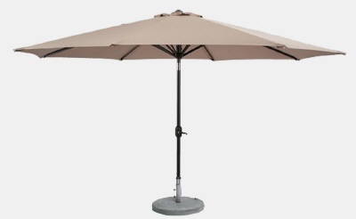 Runder Partyschirm (Ø 3,20m) mit Kurbelsystemaufzug - dadurch spannt sich der Schirmbezug besonders gut und gleichmäßig. Der weiß lakierte Alu-Mast wurde auf halber Höhe mit einem innliegendem Metallgewinde versehen, sodaß der Mast an dieser Stelle auseinandergeschraubt werden kann. So tranportieren Sie diesen Schirm ganz problemlos im eigenen Kombi. Für seitliche Sonneneinstahlung kann der Schirm auch seitlich geknickt aufgestellt werden. Sie erhalten zu diesem Mietschirm einen passenden Stein-Schirmfuß.
